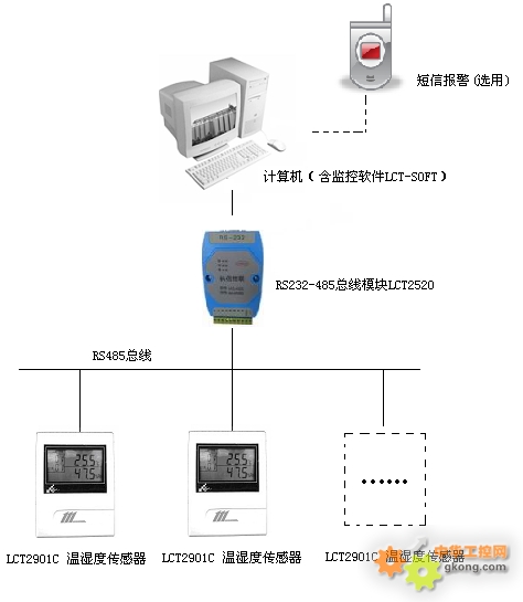(4)报警端(选用):可增加短信模块及短信软件LCT-SMS,来实现短信报警功能。