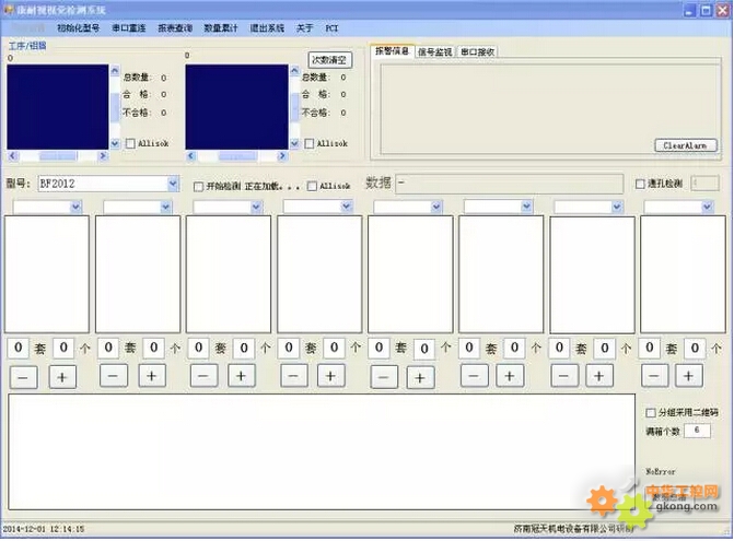 2)在旋转180度时,再次给工序检测相机一个触发脉冲信号,进行第二次工序检测。当旋转完毕时,断开铝屑检测触发信号,主程序进行两项内容的结果处理。如果不合格会将信号反馈给PLC控制系统,进行剔除。检测合格后的活塞会继续进行生产线上的其它内容检测和处理,最后到达顶面信息读取工位。应用程序读取活塞的二维码信息和分组信息,将二维码信息和ERP的信息进行重复比对,并将相关信息入库保存,如果不符合重复的次数则给出报警;读取完毕后的活塞进入分组料道后,主程序会根据实际走入的料道号与本身读取的分组设置信息比对,确认是否走错料道,并给出报警提示。
