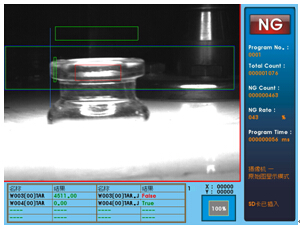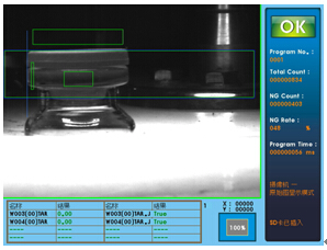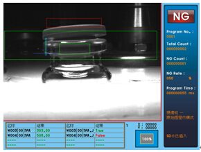 判定产品的NG的条件有两项:瓶盖丢失(如红框内无白色像素,就可以认为该瓶盖丢失);瓶盖安装不到位,其表现形式就是瓶盖倾斜,或者高度变化,我们可以在正常瓶盖上方建立一个白色像素检测区域,正常情况下应该检测不到白色像素,如在此区域出现过多的白色像素,就可以认为瓶盖没有安装到位。