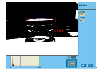 由于存在瓶盖丢失的情况,所以还必须加入检测瓶盖有无的检测。经过观察,如果瓶盖存在的话,会被光源照亮并出现许多白色像素。这样的话,可以通过检测白色像素的数量来达到检测有无的目的。如果瓶盖一旦丢失,则规定检测区域内的白色像素必定达不到额定数量,基与此就可判断瓶盖有无。