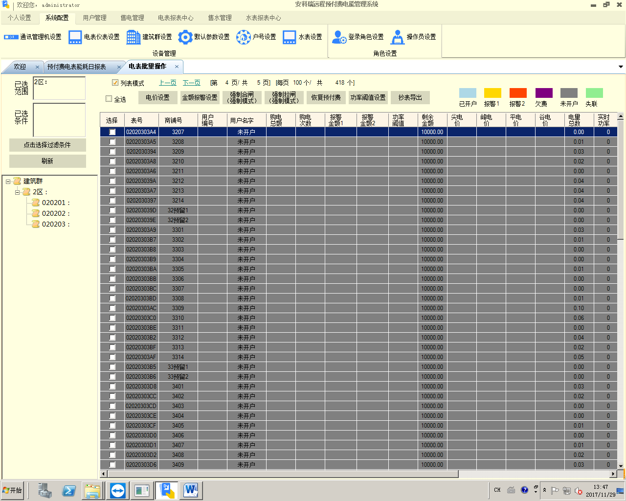 系统针对商铺开户不仅支持一户一表,也支持一户挂多表的需要;同时支持和解决了项目改造后新老表切换时,老表金额转入的问题;支持峰谷电价,支持一表一电价;可对单表设置功率过载的阈值,也支持设置单表金额报警的两级阈值。