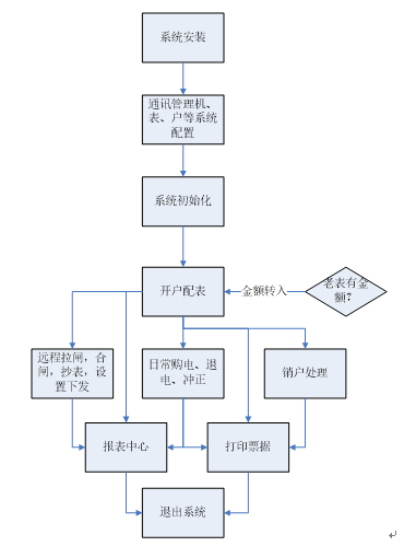 本系统分为五大模块,分别是操作员登陆模块、系统配置模块、用户(商铺)管理模块、售电管理模块、报表中心模块,系统大致运行和操作流程如下: