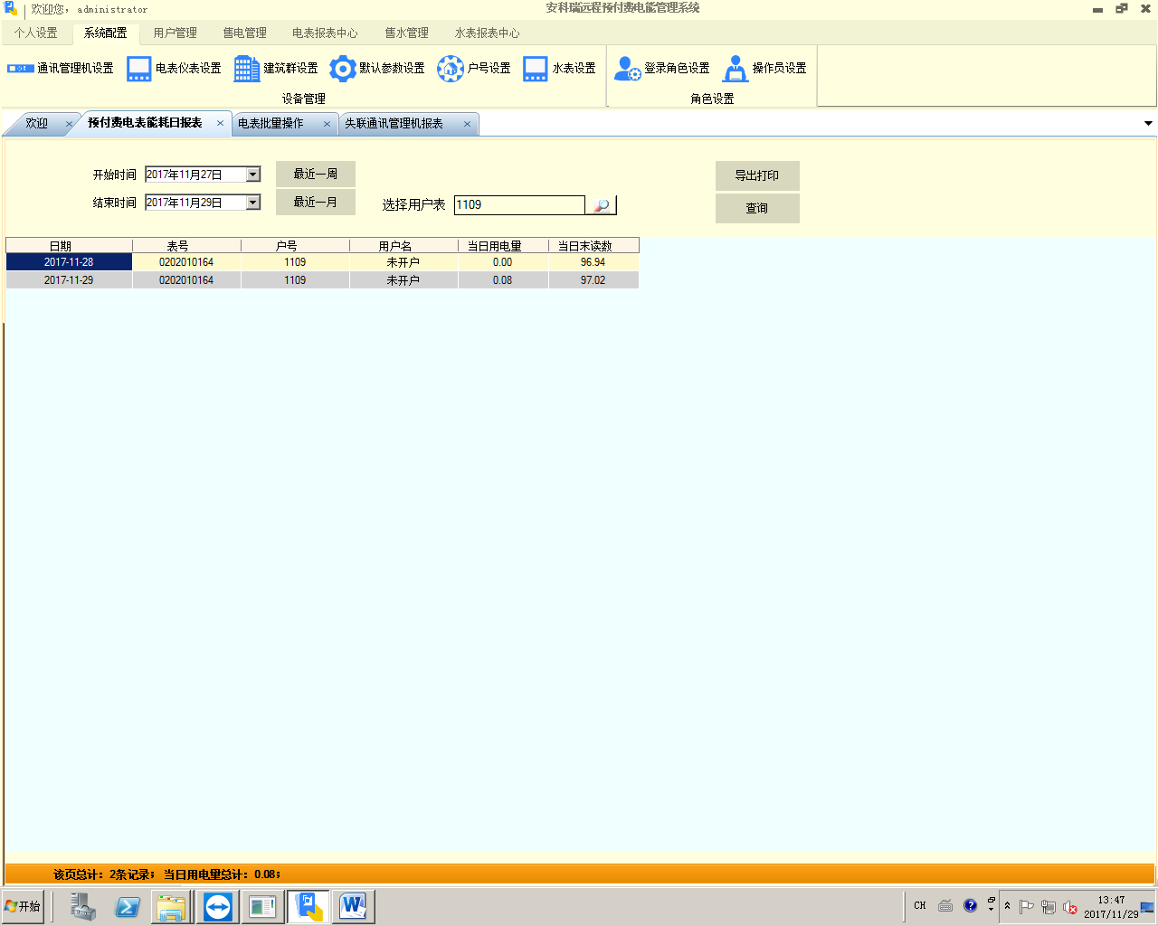系统还提供了多个报表以供查询,分别是日/月/年财务销售统计报表、失联表/通讯管理机查询报表、能耗查询报表、实时报警/历史报警查询报表,支持导出。以下是财务报表和预付费表日用能查询报表: