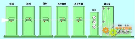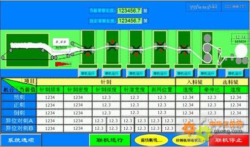 针刺机传统的控制一般是一组设备使用1台PLC、1台HMI、AMD进行控制(MODBUS通讯)。操作方便,但是布线及通讯复杂,抗干扰性能差,通讯距离短。此外,传统控制,大量的通讯程序使小型的PLC的内存(16k steps)受到极大的考验。因为设备要求通讯速率高、PLC程序内存大等问题,大部分设备厂商都选用S7-300、三菱Q系列等大中型PLC进行控制。整体生产线设备及生产工艺主要参数如图1所示。