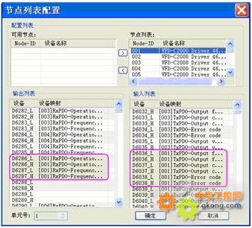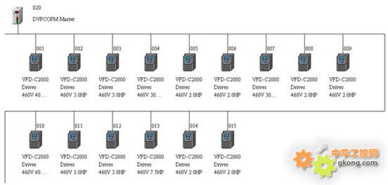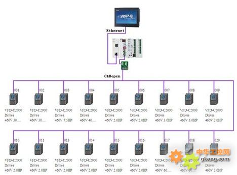 本次应用,所有变频器都选用C2000进行控制。控制模式为CANopen总线控制。组态图如图8所示。