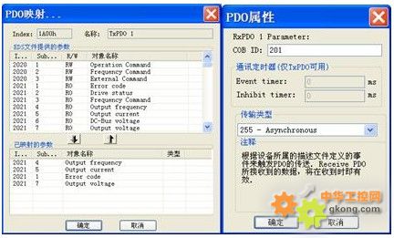 Receive PDO:Output frequency(输出频率)、Output current(输出电流)、Output voltage(输出电压)、Error code(错误信息)。同时,选择传输类别。如图10所示。