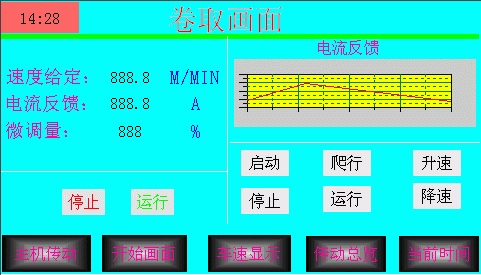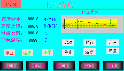 由于车速比较低,网部、压榨、大缸共用一个传动点,卷取机使用一个传动点,由统一的速度链来协调两分部之间的速度,每个传动点具有微升、微降、爬行、运行、正点、反点等功能。