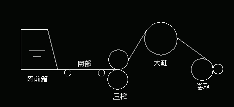 卫生纸机由网前箱、网部、压榨、大缸、卷取五大部分组成,浆料通过上浆泵送至网前箱,通过网部成型后,进入压榨脱水,通过大缸烘干,然后由卷取的冷缸完成收取成型纸页。