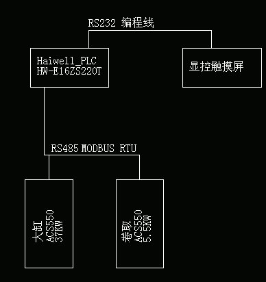 通过海为E系列PLC自带的RS232端口完成了PLC跟人机屏的通讯、通过海为自带的RS485端口完成了与ACS550变频器的通讯,只需要一条指令就完成了通讯任务,没有必要去关心复杂的中断控制、通讯冲突等问题。为节约成本,卷取的变频器没有选择ACS550,而是选用了具有同样控制性能的ACS350变频器,通过ACS550变频器的AI、AO、DI、DO来完成了与ACS350变频器的信息交换,而不需要单独购买FMBA-MODBUS 通讯卡。纸机的速度链以及各种控制动作全部在海为PLC中完成。