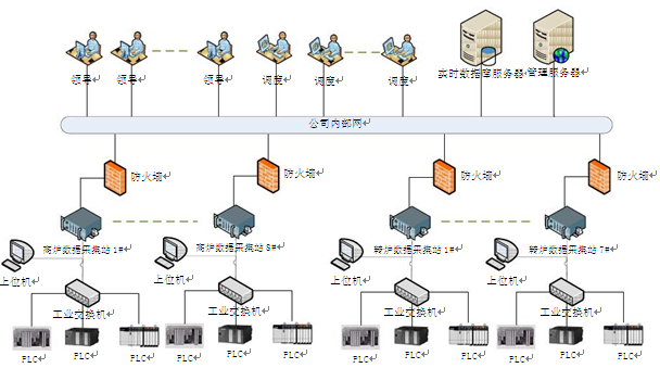 在工业以太网内设置一台采集站,该采集站负责从各 PLC 系统的主站或从站中采集生产工艺过程数据。 采集站通过防火墙接入内部网络,防火墙通