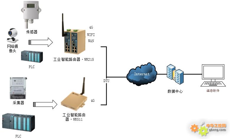 行业应用项目通常由多个分散在各地的站点组成,每个站点中有PLC(各个品牌和接口类型),网络摄像头,采集器和传感器等组成,需要将现场的数据传输到远端数据中心的组态软件上实现数据监控,应用场景有防汛监控、污水监测、河道水文监控、环境环保、气象监测、地震监测、电力监测等。