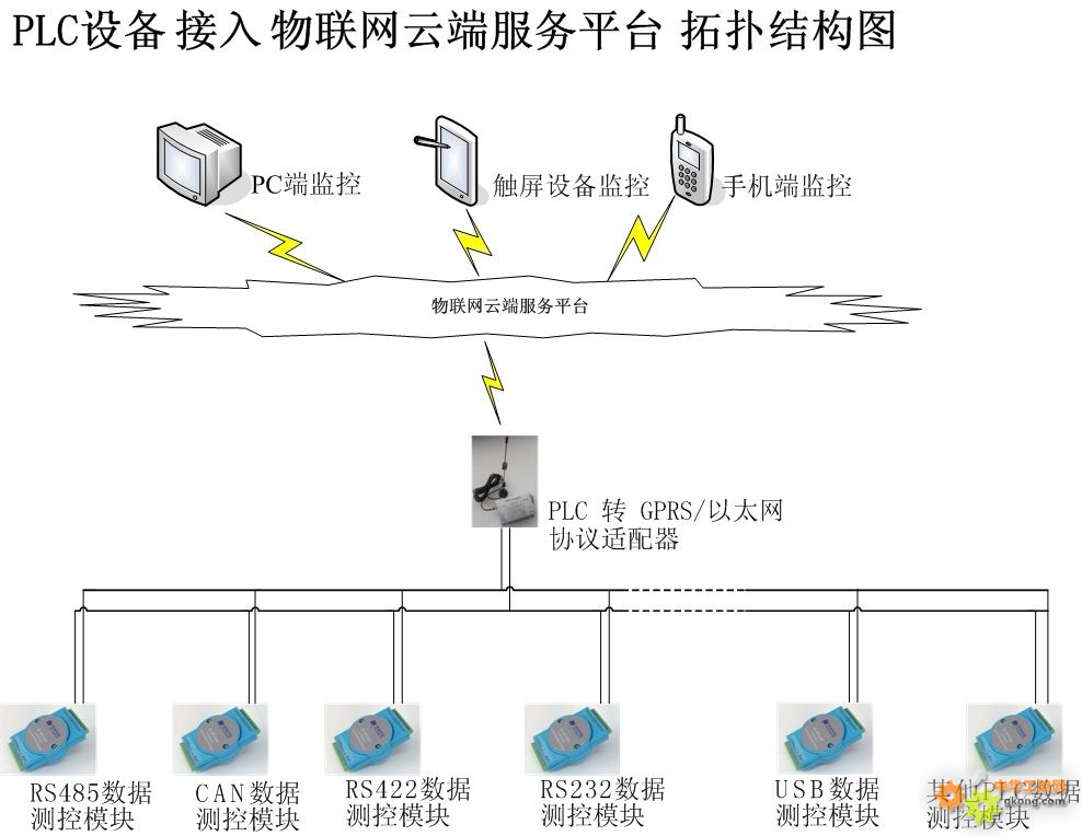 在现行的PLC系统中,数据通信接口多是RS232、RS422、RS485和CAN总线接口,我们可以将这些接口转换为以太网口,或者转换为GPRS、4G等无线信号,然后通过协议适配器把PLC采集的数据传输到物联网云端服务平台。如下图。