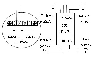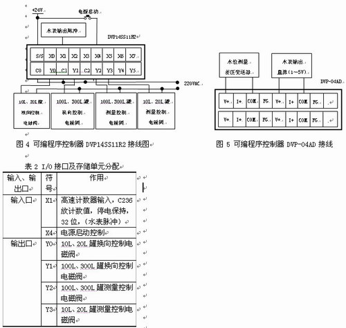 电路图如图3所示。差压变送器采用横河川仪有限公司生产的EJA110型,它是高精度(±0.075%、连续工作五年不需调校、温度和静压影响忽略不计)两线制差压变送器,作用是将工作量器的水位信号变成4~20mADC电流信号,这个电流信号与DFP-1100M型配电器连接,配电器一方面为现场安装的两线制EJA110型差压变送器提供一个隔离的电源,同时又将两线制变送器送来的4~20mADC信号转换成与之隔离的1~5VDC信号,这个1~5VDC电压信号给可编程控制器,作为自动控制的标准信号。