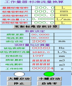 “实际标准容积计算”、“大罐启动”、“小罐启动”、“停止”、“总清零”按钮为弹起时命令语言连接,限于篇幅限制具体命令语言略写。