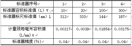 (1)标准工作量器的容积、标尺值、计量颈每毫米容积值关系,参见表1所示。