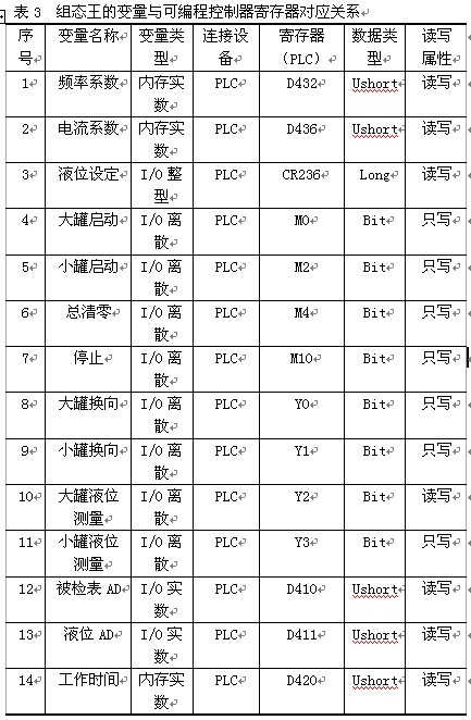 组态王变量与可编程控制器寄存器对应关系对应关系见表3所示。