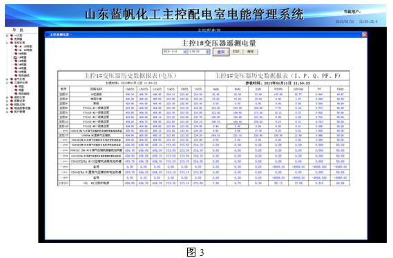5.2. 远程抄表查询:各个配电室各个回路按照时间段进行历史数据查询。选择回路后,可选择时间间隔、时间长度对该回路进行历史数据精确查询,包括电压、电流、功率、功率因数和电能等常用数据。查询结果可导出成EXCEL表格进行保存,也可打印保存,如图3