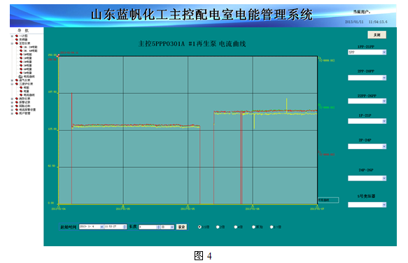 5.3趋势曲线:功率实时趋势显示及历史趋势查询功能。选择回路后,该回路实时趋势曲线会不断刷新,选择“起始时间”可查看该回路历史趋势曲线,选择“时间长度”可查看历史日、月、年趋势曲线,能更加直观反映该回路运行情况,如图4: