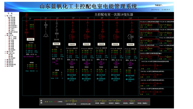 5.1. 一次图显示:Acrel – 3000软件通过中间采集设备采集现场电力监控仪表数据,并在系统一次图显示出来。如下图所示,各个回路三相电流、三相电压、有功功率、无功功率、功率因数、有功电能等电参量实时刷新显示,能直观反映该系统各进出线回路运行状况。 如图2: