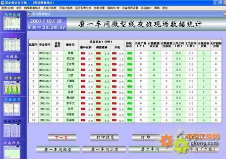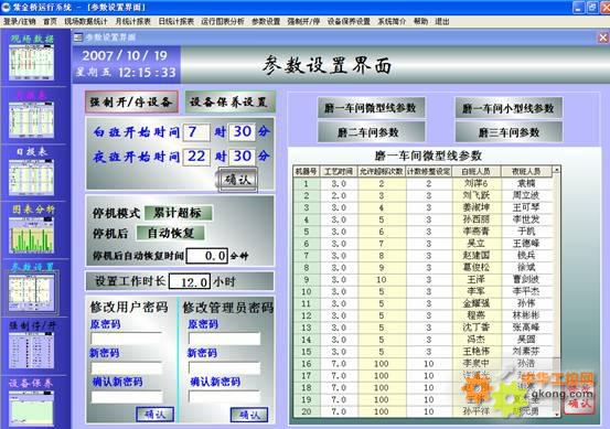 该轴承厂拥有4个车间共122台轴承生产设备,每台设备需要采集上件工时,计数修整实际值等参数,同时为了避免工人没有按照规定操作,使产品工时低于工艺时间的要求,从而造成产品质量不稳定的问题,系统会按照设定判断每个班次的超标情况,如果连续超标或者累计超标(可以设定超标模式),达到一定次数就可以自定锁定设备,而解锁可以由相关人员手工解锁或者系统到达设定时间后自动解锁。轴承厂分为白班和夜班,需要对产量、超标次数、开机时长、运转时长、超标率等分别统计。每台设备的工艺时间、计数修整、工作人员等内容载上位机中都可以自由设定。