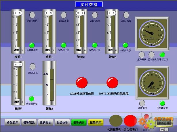 2、上位机软件能动态的显示压力、温度、液位等参数。触摸屏上可模拟罐状等,更真实、直观的测量。
