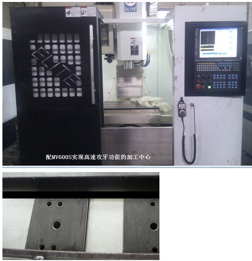 攻牙也叫攻丝,就是螺孔内螺纹的加工。目前数控机床上用得最广泛的是刚性攻丝,也叫主轴同步进给攻丝,是通过进给轴跟随主轴转速调节进给量,达到高精度螺孔的加工要求,进给速度V=主轴转速n*螺距s。数控系统的数据处理能力,伺服进给跟随能力,主轴攻丝加减速平滑度,都会影响到刚性攻丝的效果。而专门用于攻牙加工的高速攻牙机,对各部件的性能要求更高。SV-MASTER已在高速攻牙机上得以成功应用,且攻丝效果获得客户一致好评。