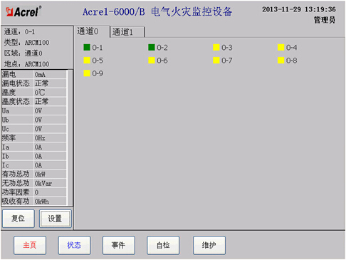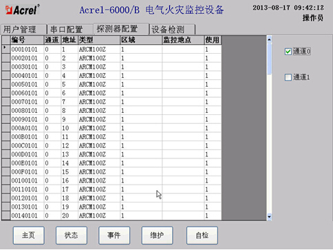 在状态界面中,操作员可以直观的看到所有连接到监控设备的探测器的状态,探测器的状态以颜色进行区分,绿色表示正常,黄色表示故障,红色表示报警。