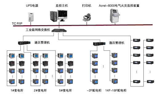 大型建筑群,楼层高,多栋楼体分散。采用Acrel-6000/Q电气火灾监控设备+ACREL6000/B电气火灾监控设备+电气火灾监控探测器三层结构组网模式,便于区域化管理,采用RS-485网络通信,以太网通信,以太网通信,满足了通信实时性高的要求。