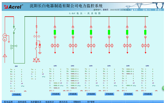 系统依据客户实际需求进行设计,并实现了一次主接线图界面显示,如图4所示;电参量遥测及电参量越限报警;事件记录;系统运行异常监测;故障报警及操作记录;报表查询与打印;系统负荷实时、历史曲线,用户权限管理等主要功能,如图3所示。