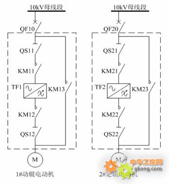 针对上述分析,高压辊磨机定辊和动辊电气拖动系统,需分别配备一台高压变频器和一套工频/变频自动切换系统,用于该系统变频拖动,以及变频故障条件下的原有系统恢复。系统电气原理图如下,其中QF表示高压开关柜、QS表示高压隔离开关、KM表示真空接触器、TF表示高压变频器、M表示电动机,虚框内为新增设备。
