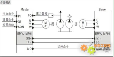 台达双泵合流驱动产品通过伺服控制器的485总线实现对分系统的协调控制,用合流后的压力作为压力反馈。上位机的给定压力和流量命令信号接入主泵(控制器),主泵通过485总线将数字命令传输给从泵,合流控制中的各个伺服控制器根据应用需求确定最节能的工作状态,协同控制各电机的力矩和转速,确保系统压力和流量的快速响应,压力和流量的稳定,以及制成过程中的平稳转换。