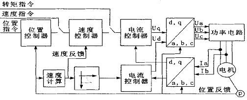 伺服驱动器控制交流永磁伺服电机( PMSM)伺服驱动器在控制交流永磁伺服电机时,可分别工作在电流(转矩) 、速度、位置控制方式下。系统的控制结构框图如图4所示由于交流永磁伺服电机(PMSM) 采用的是永久磁铁励磁,其磁场可以视为是恒定;同时交流永磁伺服电机的电机转速就是同步转速,即其转差为零。这些条件使得交流伺服驱动器在驱动交流永磁伺服电机时的数学模型的复杂程度得以大大的降低。从图4可以看出,系统是基于测量电机的两相电流反馈(