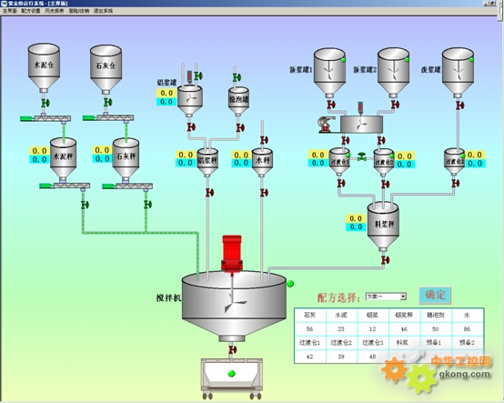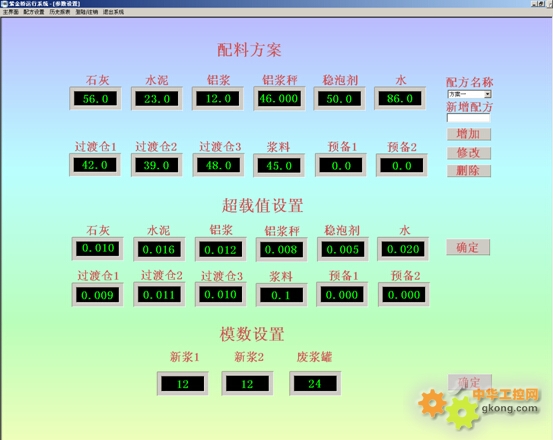 在生产过程中,可以动态的增加、修改、和删除配方,将配方保存后,操作人员只需在主界面选择配方的名称就可以完成整个配料过程。
