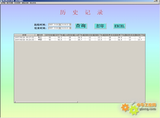 系统会自动记录每一次配料的参数,包括操作人员的名称、时间、设定值和实际下料值等。只需选择好起始时间和结束时间就可以得到所需要的历史记录,还可以将数据导入EXCEL等关系库中,并且支持打印。