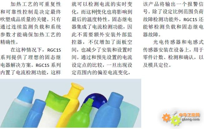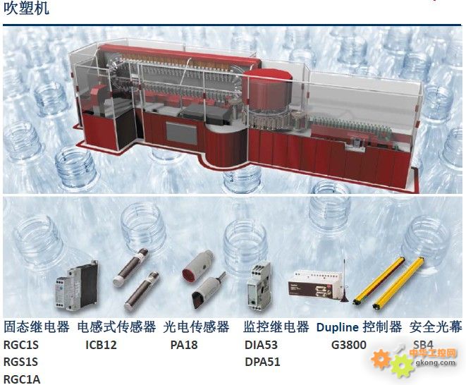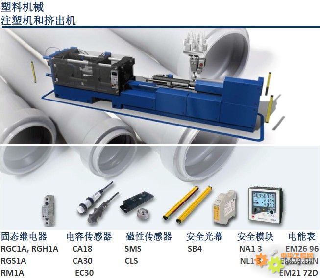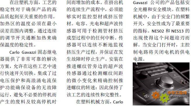 根据市场需求设计经历了数年的经济衰退之后,预计塑料机械行业的全球需求将会增长。根据市场分析,这种增长受制造业生产复苏及塑料制品和塑料包装的需求带动。挤压设备工厂将受益于全球建筑行业的增长,这将推动挤压管材和管件等货物的需求。注塑成型设备仍将是最大的市场需求之一。注塑机用途广泛,涵盖汽车零部件、日用消费品和医疗用品等领域。Carlo Gavazzi 提供各类固态继电器(SSR),采用铜板覆膜技术延长使用寿命和提升产品的可靠性。在吹塑工艺中,精确的温度控制是保证成品质量的关键。SSR 可提高生产工艺的控制水平,并允许频繁开关负载。采用集成的晶闸管,Carlo Gavazzi 固态继电器为吹塑薄膜挤出和注塑成型技术提供了非常稳定的开关性能,最大限度地提高工厂的正常运行时间和减少生产损失。Carlo Gavazzi 公司已获得专利TripleshieldTM电容传感器已成为所有其他制造商的业界标杆。电容传感器可以检测大多数材料,包括导电和非导电的材料。这使其非常适合塑料原料输送系统的料位检测。Carlo Gavazzi 的超声波、光电和电感式传感器亦广泛应用于塑料机械。超声波传感器非常适合于检测透明物体,其他传感器不适合对这类物体进行可靠地检测。为了保证工作区域的安全性,确保操作人员的安全和机器的安全运行,CarloGavazzi 提供安全光幕、安全模块和安全磁性传感器。